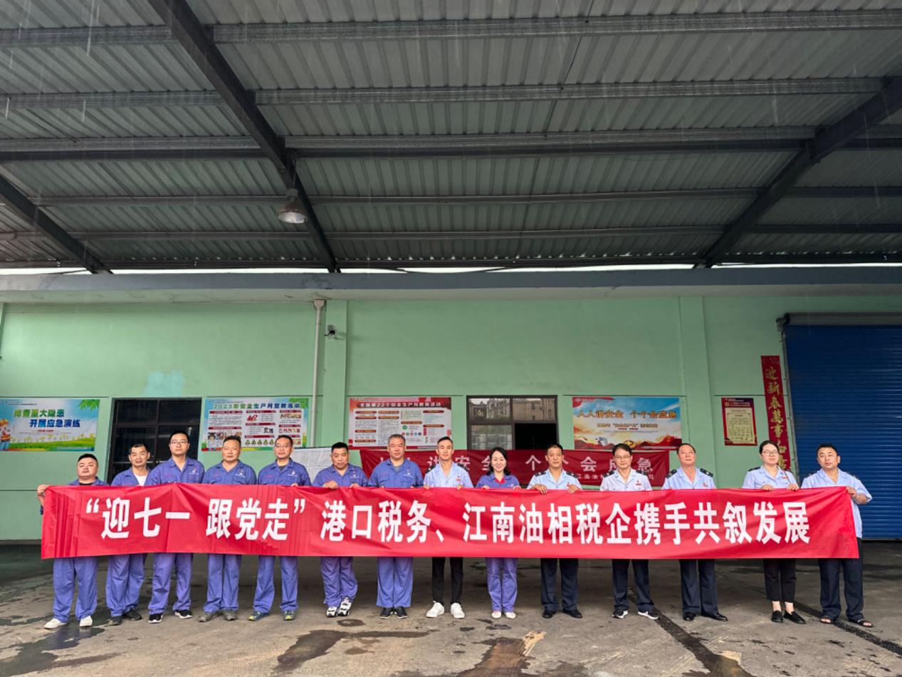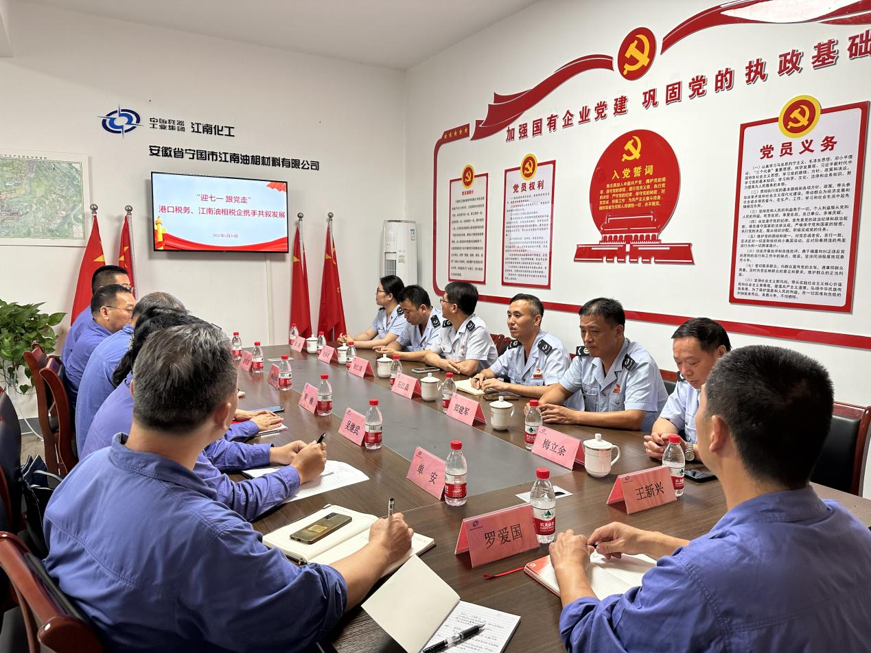 江南油相材料有限公司党支部与宁国市港口镇税务局党支部联合开展“迎七一 跟党走 税企携手共叙发展”主题党日活动。活动中,全体党员重温入党誓词,并学习了《习近平对党的建设和组织工作作出重要指示》。双方党员就党的二十大精神学习宣传贯彻情况进行交流,表示将沿着党的二十大精神指引,守正创新、勇毅前行,共同为地方经济发展贡献力量。