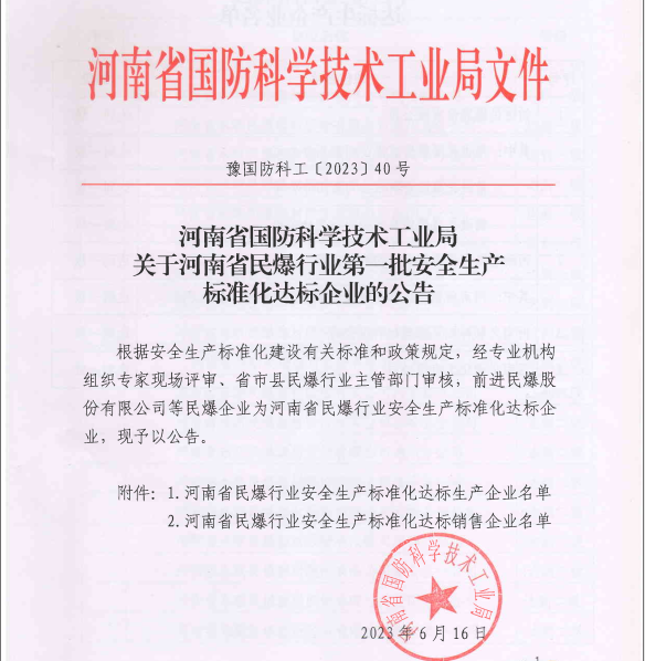河南华通获评河南省民爆行业安全生产标准化一级达标企业
